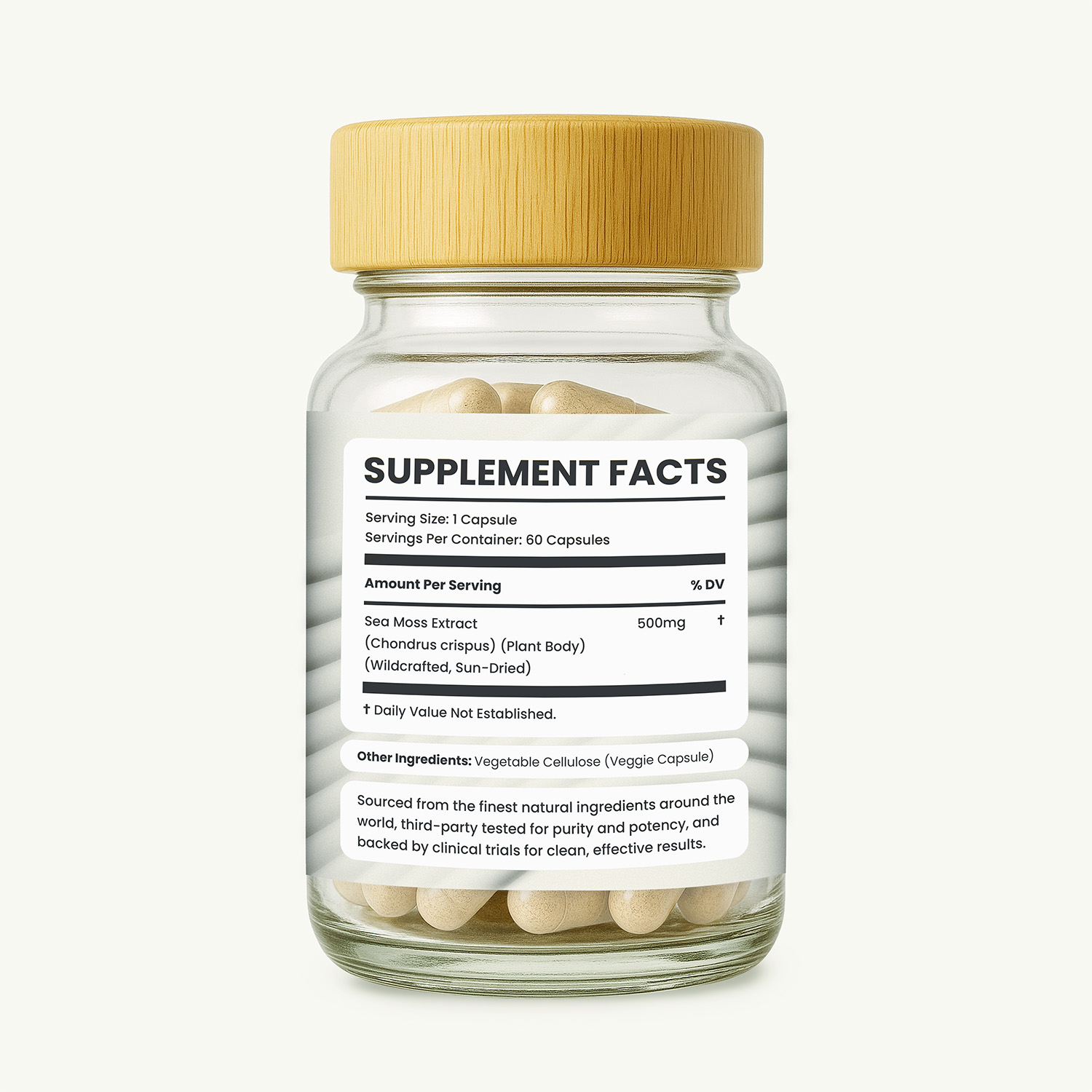 Each capsule delivers a standardized iodine concentration—47 mg per gram of raw Sea Moss—so two daily capsules provide approximately 0.6 mg of bioavailable iodine, promoting optimal T3 and T4 synthesis while maintaining hormonal equilibrium.